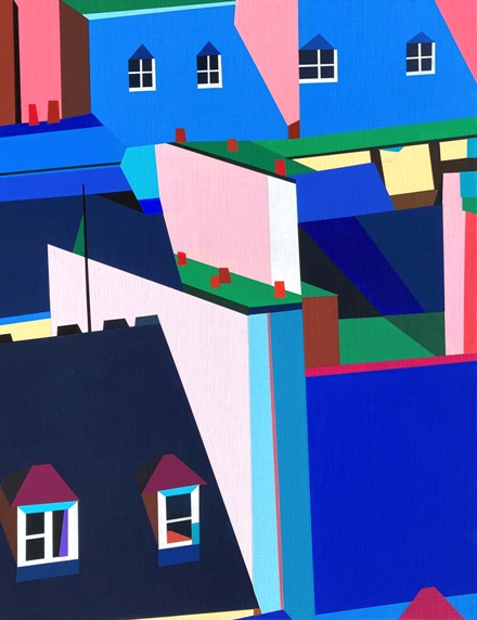 他在面孔相遇、交叉的城市形態與複雜密集的建築之間的關係中尋找自己的存在和情緒的穩定。作品中出現的風景都是不同側面重疊、拼湊成各種形狀的碎片,並經歷了被建造成建築物、成為街道和道路的反覆過程。而這些大大小小的碎片(碎片的面)被組合起來,逐漸轉變為和諧的城市景觀。