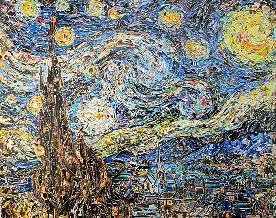 Vik Muniz 透過雜誌圖像的拼貼,重新詮釋Van Gogh的名作「星夜」,作品尺寸226x180cm。