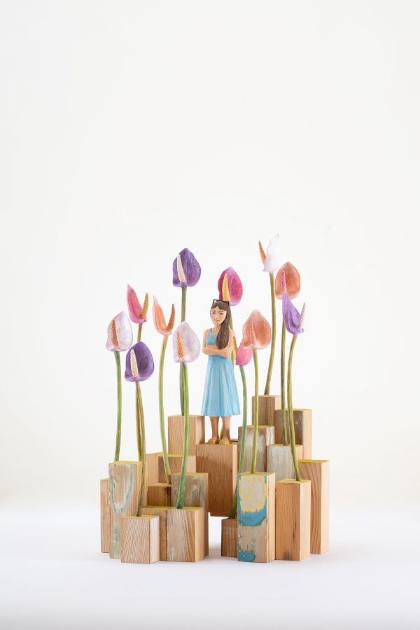 作為同展唯二的木雕藝術家,「Ori-carving」系列是周學涵近年主要創作的 主題,在多元的創作脈絡裡,周學涵持續懷抱著一種詩興對事物進行微弱的想像。期許任何現成物、材料─如靜 物、摺紙或廢紙片─在持續「強烈地微觀」 驅使下,會產生不可言說的變化,本次的系列作品即是在此邏輯下,以木材質模擬紙質的趣味概念,將非恆定的摺紙造型定格,同時賦予姿態和肌理「有機感與生機感」的想像,進而使這些造型能重新獲得原本所模擬之生物對象的精神憑依。