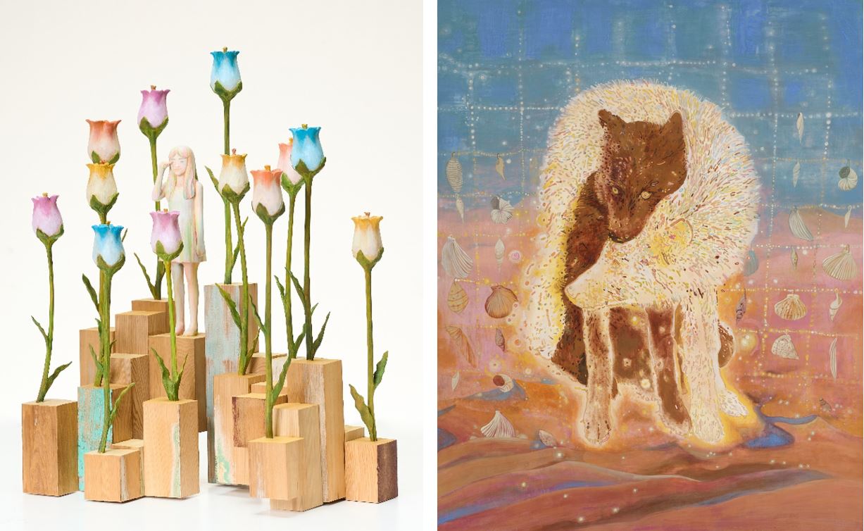 另外,幾乎集中在90後的世代,卻在傳統水墨、繪畫、雕塑等專業訓練上使用墨、膠彩、油彩、金銀箔及檜木雕塑的媒介來試圖呈現當代新語彙的作品,其中木雕塑藝術家江基名,其在2020年創作的「森系列」雕塑,端詳著不同姿態的少女,並以台灣珍貴木材檜木作為雕刻材並制作成各種療癒人心的微型場景來表達人與物的細微變化。