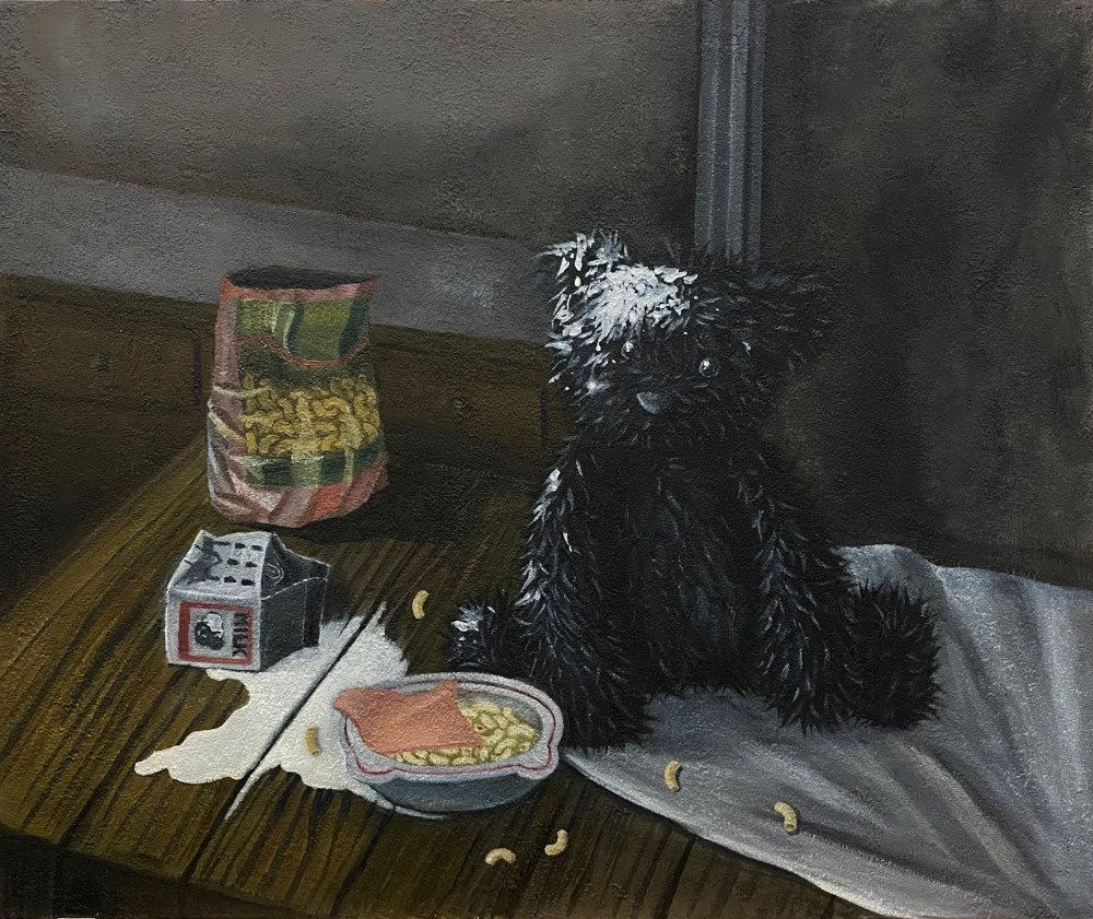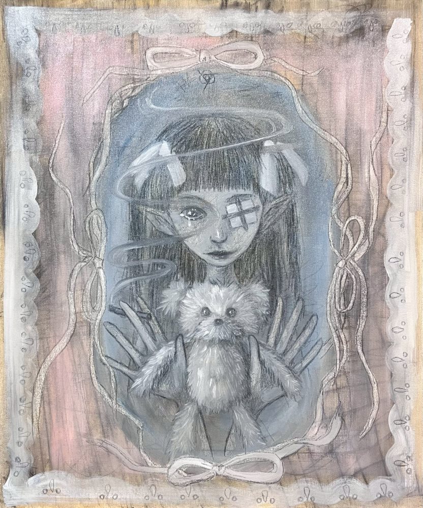 林郁珮與艾卡皆從童年記憶與內在經驗出發,將難以言說的感受,一點一滴轉化為為具象的畫面。兩人雖風格迥異,卻同樣以情感作為創作的起點,形構出一端柔軟安放、一端直面現實的情感張力。林郁珮的創作,如同為心靈搭建一座可以暫時停泊的風景;艾卡的作品,則迫使我們直視內心深處的情緒裂縫。兩人的創作宛如人生的不同階段,在承受、崩解、修復與重整之間反覆來回,構成一條真實而當代的情感軌跡。