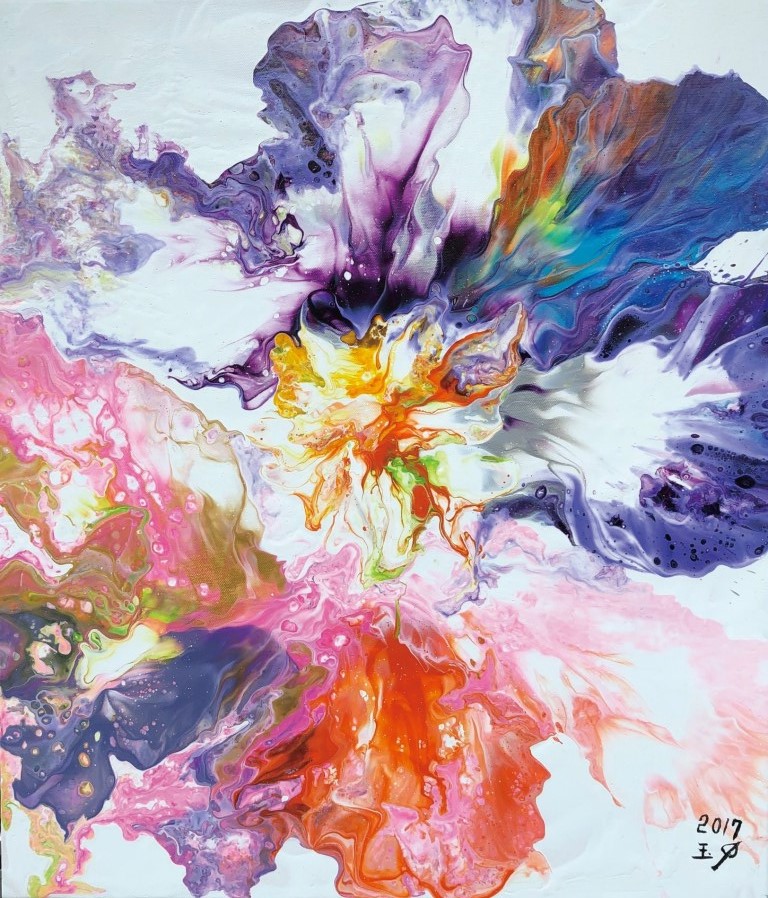 「抽象繪畫是『心境』,它自然會有所不同,看到更多的自在、閒適與宏放。讓自己什麼都不想,自由地隨情感帶動,漸漸帶出自己要的東西,總是以實驗態度創作,最有趣的是那預測不到的過程,因為實驗才發現新東西。創作新(生命)作品,藝術家絕對不能以製造商品的心情來創作作品。」