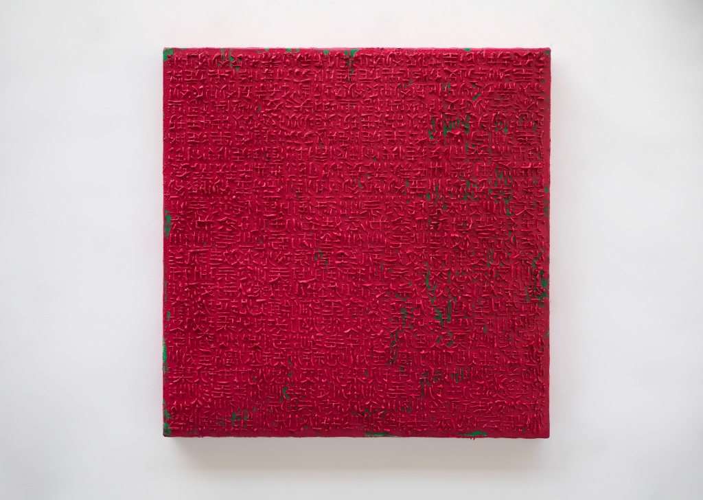這個系列作品既顯現出高度的單色“滿畫”技巧,又有著不動聲色的哲學解構意味。直觀來看,“空層”的符號有兩類,一類是無語義的漢字,另一類是密集的人體。但兩類符號都不是現成符號挪用,可以說是從漢字生成的意象,作者把前一類稱之為“亂碼”,而後一類儘管處於具象和抽象之間,但還是可以看到“象形”文字的影子。這裡泛指的“象形文字”,即是形象,也是現象。