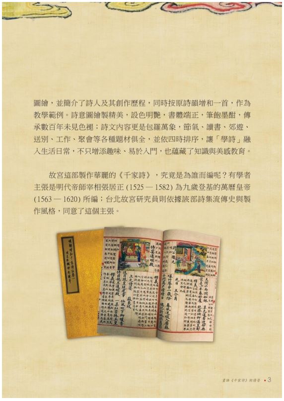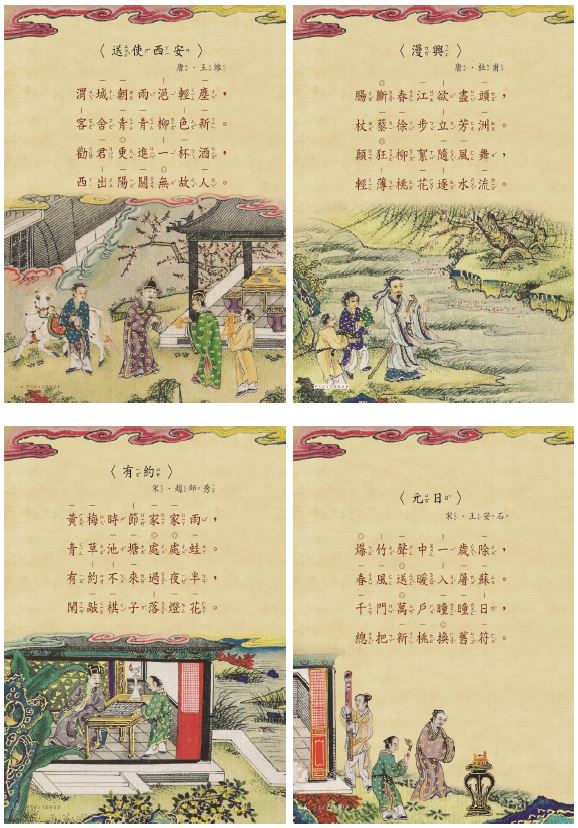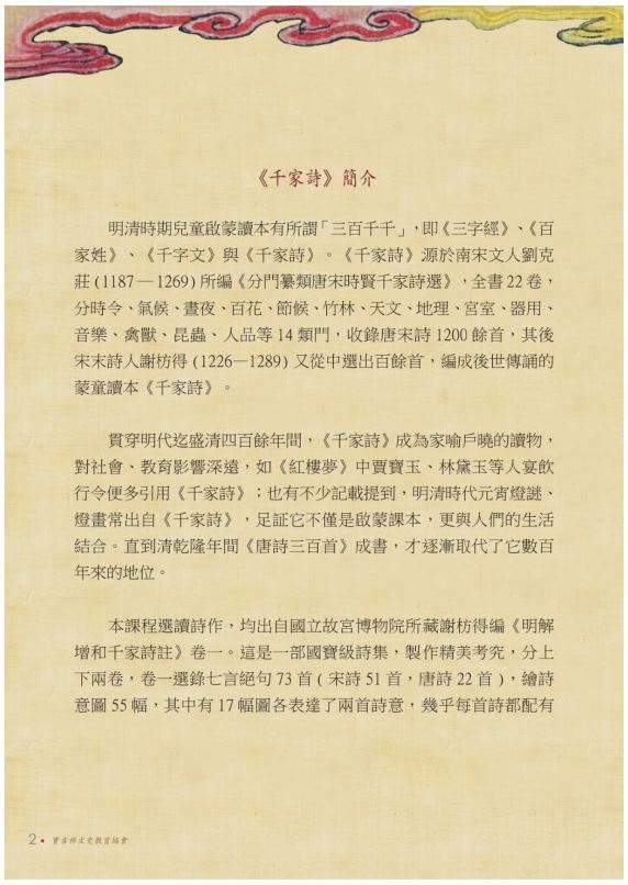 「畫語《千家詩》朗讀營」講義:選錄台北故宮所藏《明解增和千家詩註》上卷七言絕句4首,並下載原書彩繪〈詩意圖〉4幅。詩句上音符,為主講人李正芬教授註記,「-」長音,「|」短音,「◎」重音。美術編輯:黃子宴小姐。