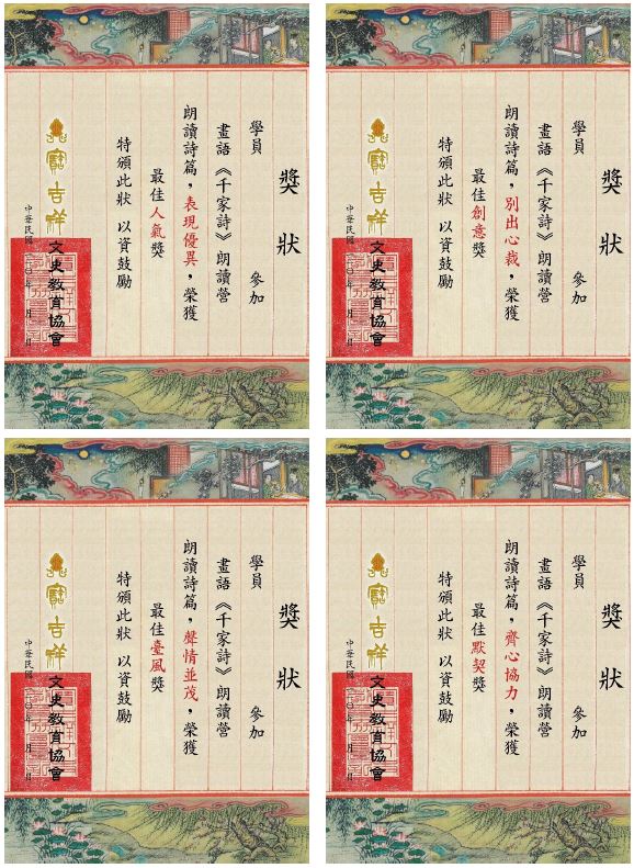 根據朗讀表現,由李正芬教授評定,分別贈予:「表現優異•最佳人氣獎」、「別出心裁•最佳創意獎」、「聲情並茂•最佳臺風獎」「齊心協力•最佳合作獎」。