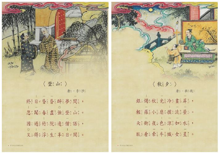 「畫語《千家詩》朗讀營」講義:選錄台北故宮所藏《明解增和千家詩註》上卷七言絕句4首,並下載原書彩繪〈詩意圖〉4幅。詩句上音符,為主講人李正芬教授註記,「-」長音,「|」短音,「◎」重音。美術編輯:黃子宴小姐。