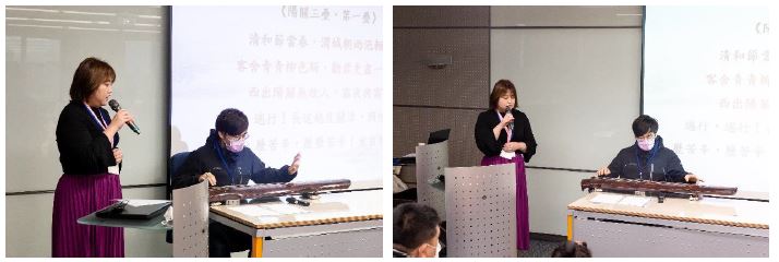 王維的〈送使西安〉在唐朝便有人譜曲吟唱,即著名的「陽關三疊」,傳唱千年迄今。助理蘇家俊與莊淑琳再度合作示範彈唱「陽關三疊」,讓學員感受詩歌之美。