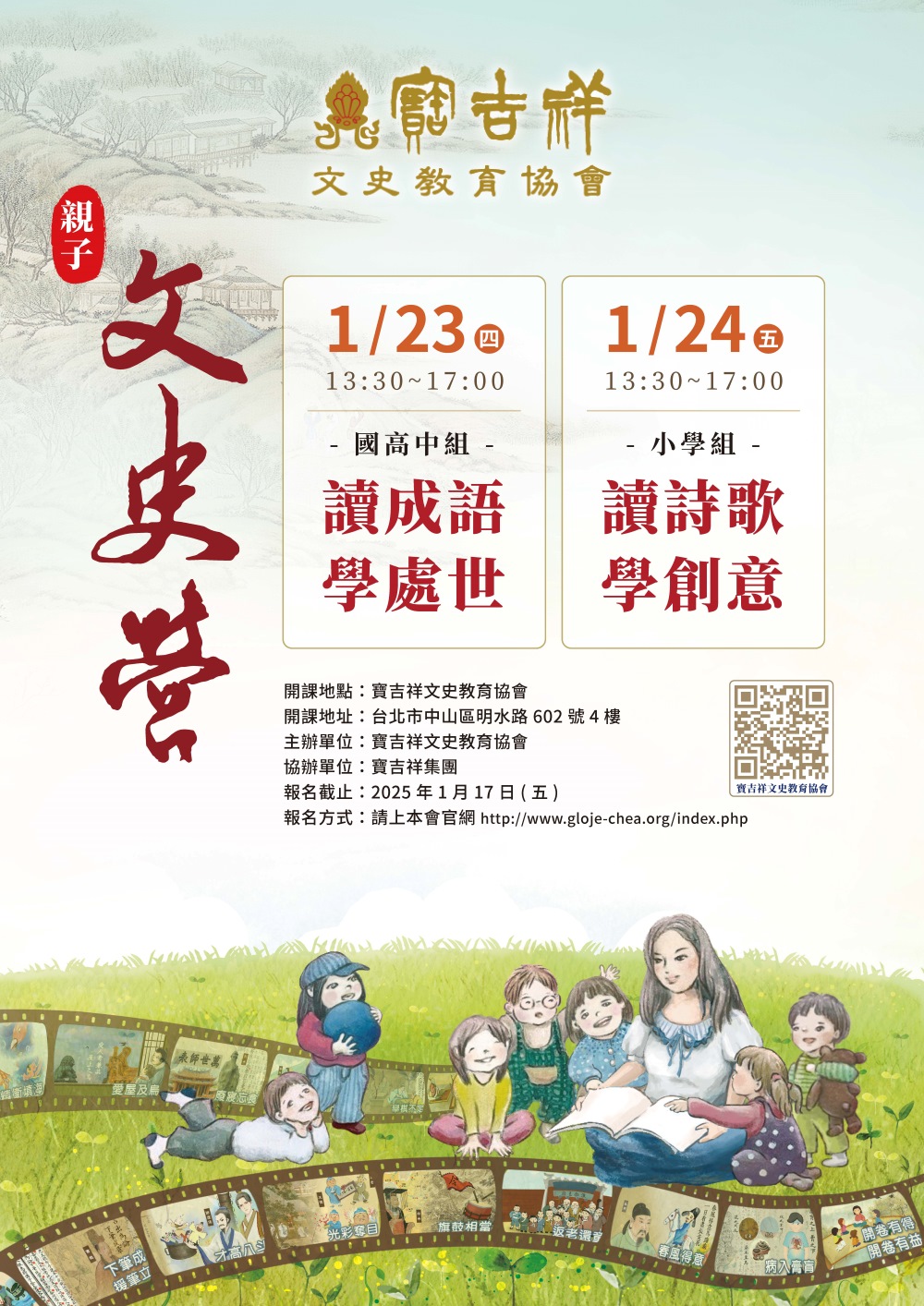 本協會為增進國人對歷史文化的認識,厚植語文能力與人文素養,於寒假期間繼續舉辦「寶吉祥親子文史營」,歡迎國小至高中學生踴躍報名參加,亦歡迎親子共同報名。