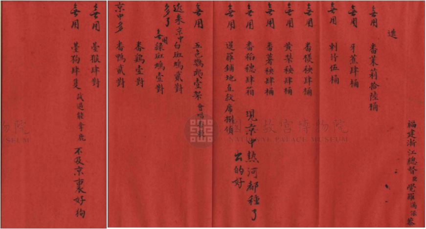 到了3月28日,滿保又上了〈奏為進送臺灣番子及土產芒果等摺〉,摺中附了一件用漢文書寫在紅色紙張上的〈進物清單〉,詳細開列所獻方物,包括:番茉莉16桶、牙蕉4桶、剌竹5桶、番檨秧(芒果苗)4桶、黃梨秧(鳳梨苗)4桶、番薯秧4桶、番稻穗4箱、暹羅鋪地直紋席8領、會唱番歌五色鸚鵡壹架、白斑鳩2對、綠斑鳩1對、番雞1對、番鴨2對、臺猴4對、臺狗4隻。