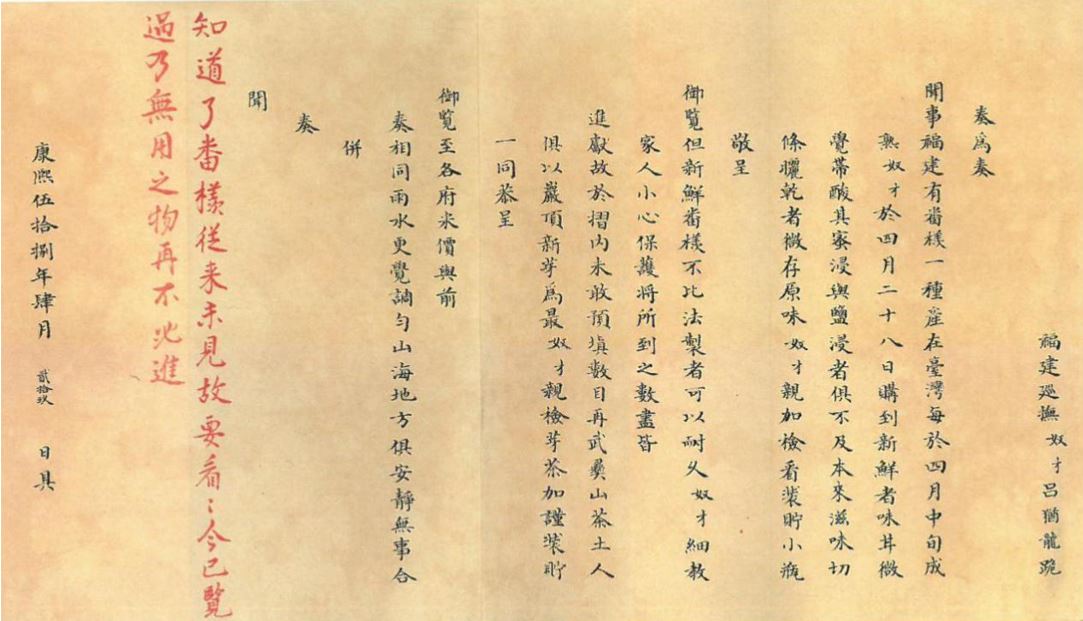 康熙58年4月29日,閩浙總督覺羅滿保與剛上任的福建巡撫呂猶龍,分別以滿、漢文書寫〈奏進臺灣番檨及武夷山巖茶摺〉,兩摺內容完全一樣,康熙皇帝覽摺後,在滿保摺中以滿文硃批,在呂猶龍摺中以漢文硃批,批示的內容也完全一樣,十分有趣。