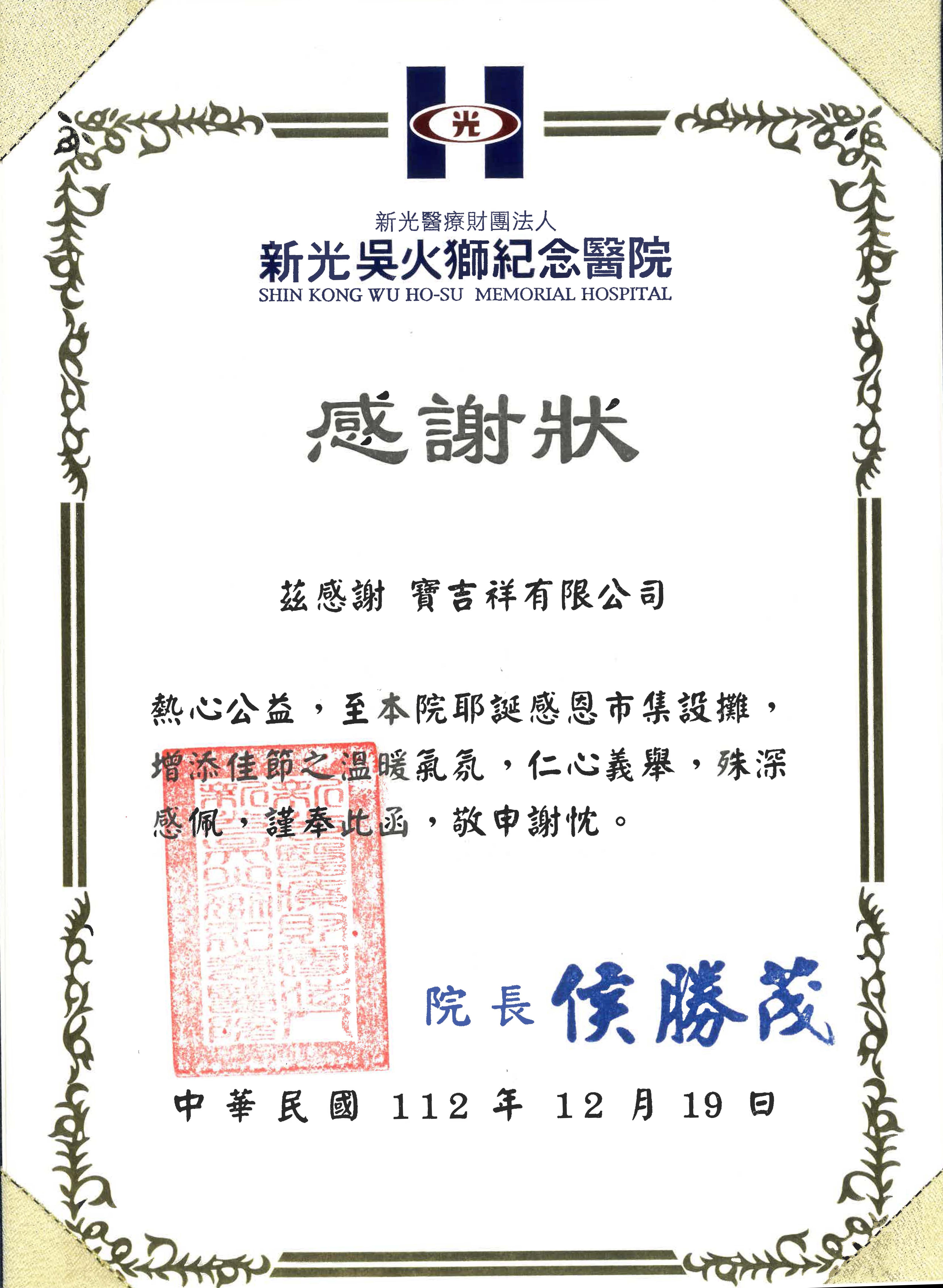 2023寶吉祥有限公司受新光吳火獅紀念醫院邀請參與12/18-12/20感恩市集活動。 每年集團總裁都將活動收益(扣除5%營業稅)捐贈至醫院的安寧專戶,一同支持一線台灣醫療人員,為病患提供幫助。