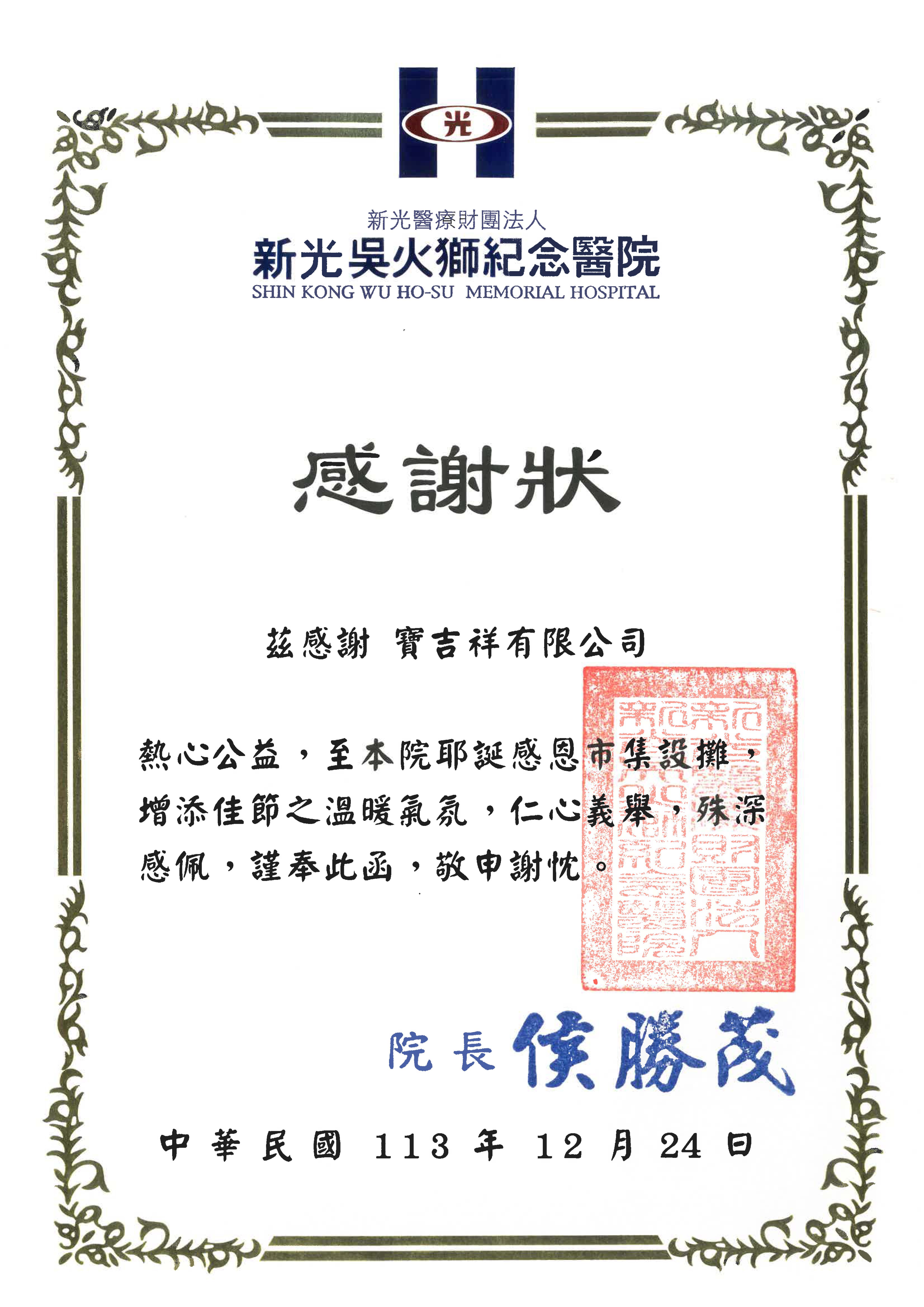 2024寶吉祥有限公司受新光吳火獅紀念醫院邀請參與12/23-12/25感恩市集活動。 每年集團總裁都將活動收益(扣除5%營業稅)捐贈至醫院的病患專戶,一同支持一線台灣醫療人員,為病患提供幫助。