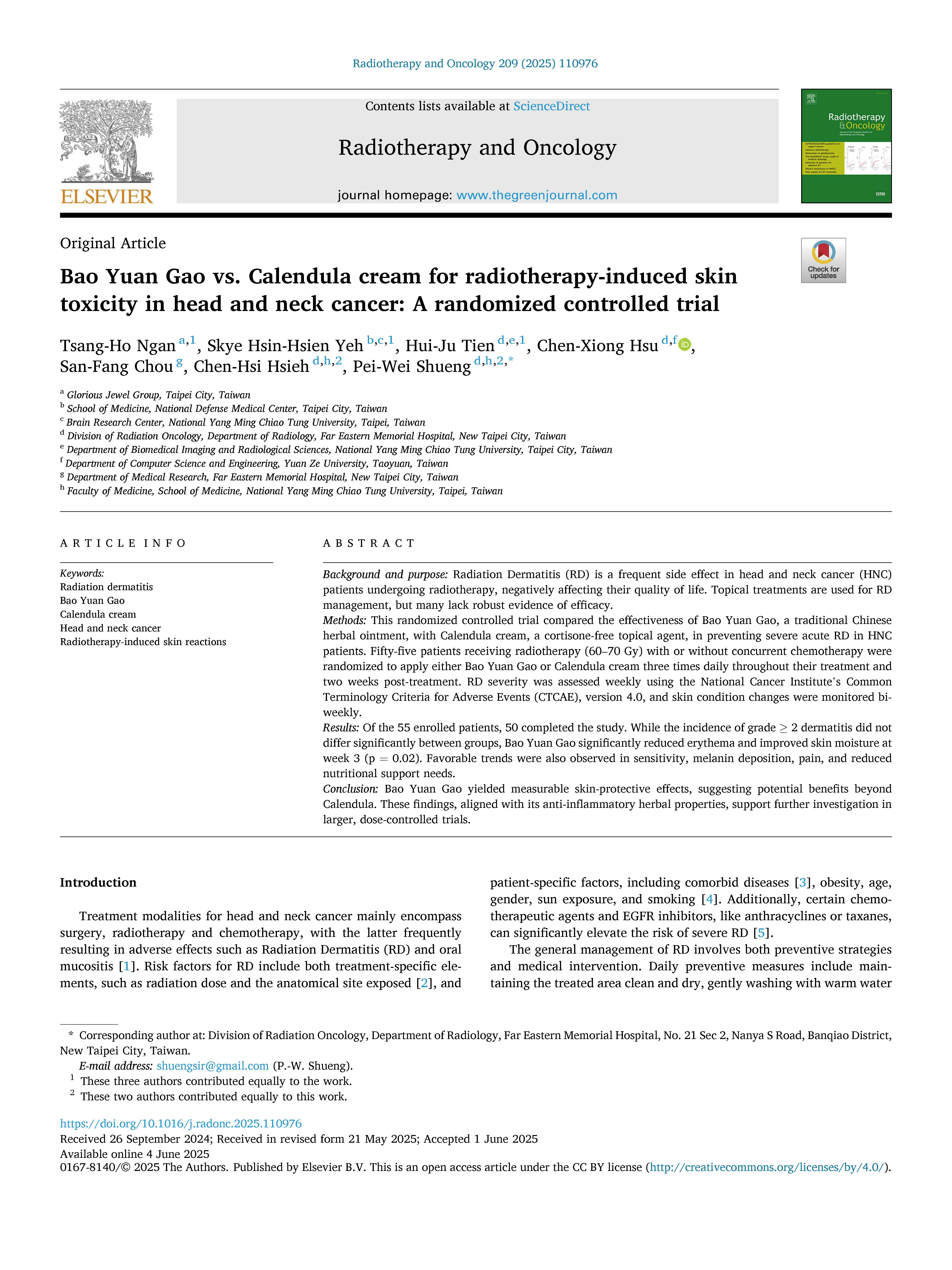 本集團支持的傳統中藥膏「寶圓膏」,其臨床研究成果近日獲國際高度肯定,正式刊登於歐洲放射腫瘤學會(ESTRO)官方學術期刊 Radiotherapy & Oncology。該刊為全球放射腫瘤領域頂尖期刊之一,長年位居核心引用指標之列,影響因子逾5,審查嚴謹、錄取率標準極高。在西方醫學體系裡,對中藥向來不寬容。能在這樣的旗艦級核心期刊中看見一篇中藥膏的臨床研究,相當少有難得。
